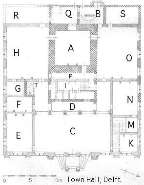 The Delft city hall is a remarkable and festive building, both inside and out. Of the original mediaeval building of the Stadhuis or Raadhuis, located on Markt square, which burnt down in 1618, only the squat central tower towards the back now remains. The rest of the edifice was rebuilt around it in 1620 in a festive Northern Renaissance style by architect Hendrick de Keijser (1565-1621).