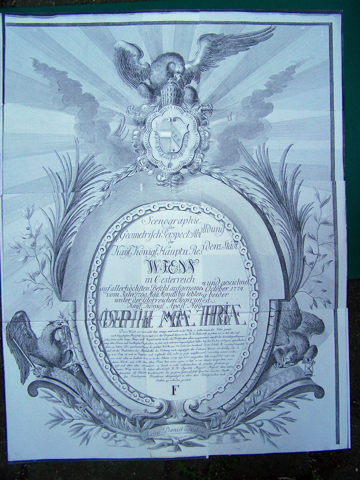 1. A big time introduction F sheet to the project. The introdution sheet states, in my English translation: "This work is justly the only and first in the world, so close to nature, made in the indicated scale, the original map is to be seen in the Royal and Imperial library, every thing having its correct place, measure and proportional height (...) This whole work consistying of 24 sections is shown all together in sheet Z (...) everything as clear as it looked like in the years 1769 to 1777 (...) so that citizend and visitors may find their way (...) Printed by permission of... (etc)". See note 3.