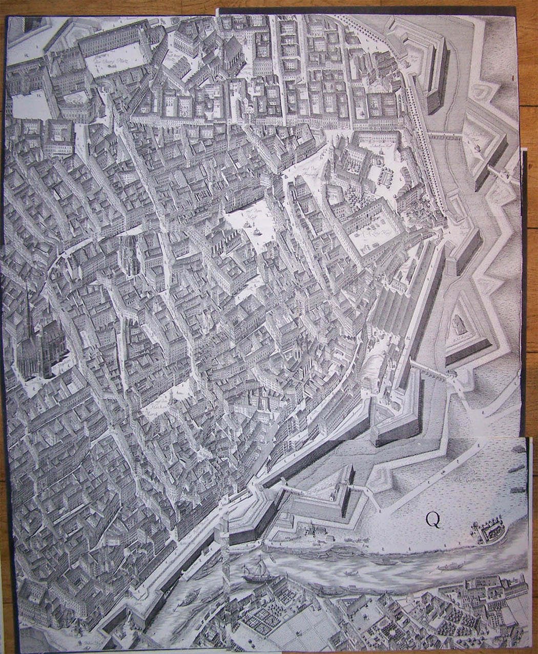 To my amazement my request for making photocopies was immediately OK-ed in 1990. They had a large b/w photocopying machine right there in the library map room. The hinged top was taken off and the copier, with a flat top, was set to print 100% size prints (thus 1 on 1 true size) on large paper sheets in A3 size (420 x 594 mm = 42 x 59.4 cm). Then the big original 18th century large map sheets were moved in steps across the machine top and series of prints were thus made of overlapping sections of map sheets and Flash! the copies were made. Scanning across all originals I received about 30 prints in A3 size. This way I owned at minimal cost a number of high quality 100% size sets. I decided to only ask for photocopies of the one presentation sheets and of the two inner city sheets. And not of all 24 sections.