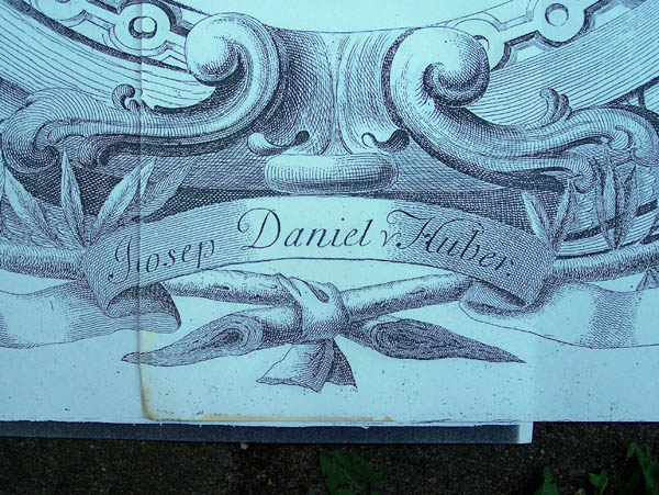 Above: Huber, Sheet F, introduction text in my English translation: "This work is justly the only and first in the world, so close to nature, made in the indicated scale, the original map is to be seen in the Royal and Imperial library, every thing having its correct place, measure and proportional height (...) This whole work consistying of 24 sections is shown all together in sheet Z (...) everything as clear as it looked like in the years 1769 to 1777 (...) so that citizend and visitors may find their way (...) Printed by permission of... (etc)". See note 3.